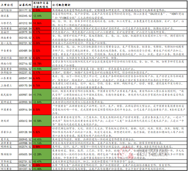 黄金关联股票:白银有色(601212)、湖南黄金(002155)、中金黄金(600489)、金贵银业(002716)、中润资源(000506)、恒邦股份(002237)、山东黄金(600547)、航民股份(600987)、莱绅通灵(603900)、中国黄金(600916)